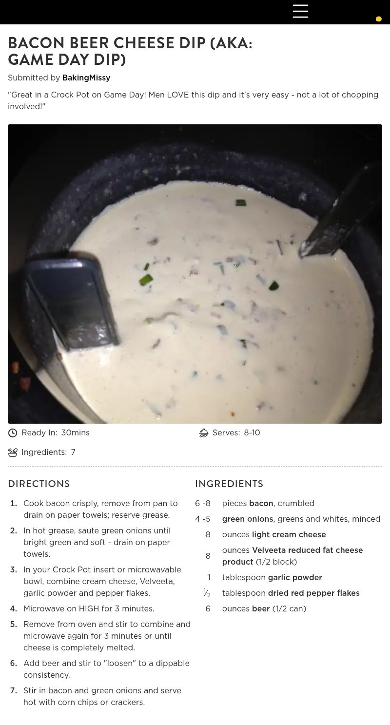 This dip was good, very cheesy/bacony....at our Super Bowl party, I had it in my crockpot that has a paddle for stirring. Great! How could it not be great? Cheese....bacon....beer! Oh yes! We had some venison burgers on the grill and this 'dip' made a truly gourmet tasting sauce! Got to love that, thinking of the possibilities...not just a dip anymore!