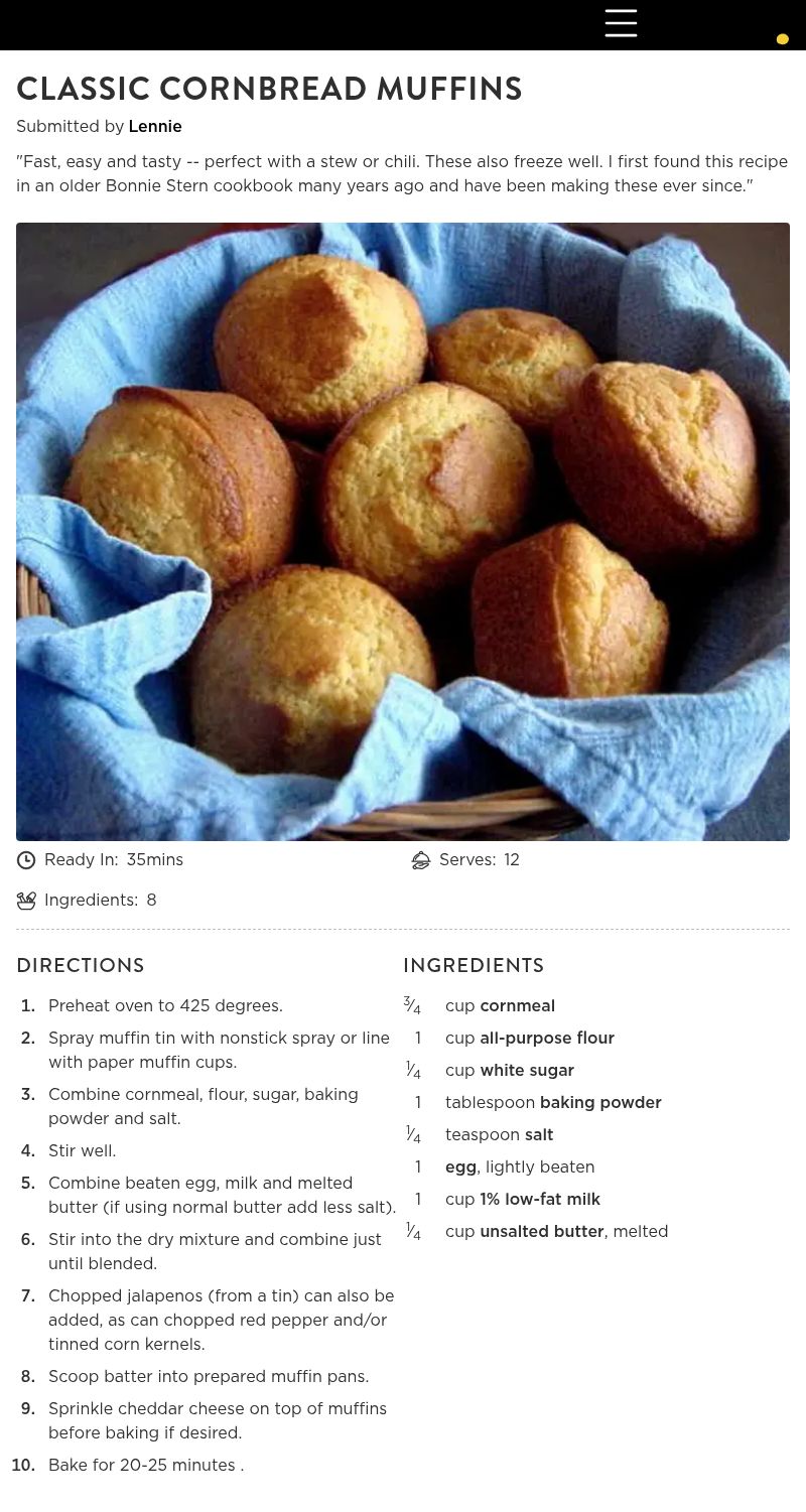 - Combine cornmeal, flour, sugar, baking powder and salt.