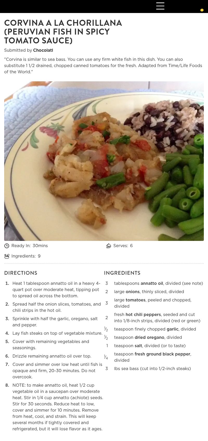 We enjoyed this very much! Healthy and simple technique. Made a wonderful weeknight meal. Next time I would increase garlic a tad. Nice combination of onion, tomato, and jalapeño peppers which is so pretty. Reduced recipe for 16 ounces of fish, and DH and I ate every morsel! Living here in north-woods of Wisconsin, I was unable to buy sea bass and for some odd reason the grocery did not have haddock or cod either so bought pollock which is not 1/2 inch thick. Mine did over cook which you see from pic, had on 30 minutes-- should have been maybe 25. For the annattoo seed which I could not find and according to kitchen dictionary knew we would not like turmeric so did differently, (for 16 ounces fish) I subbed in 1/4 cup vegetable oil, 2 tablespoons ground cumin, and 2 teaspoons chile powder, let set without heat, and then did strain. Served with http://hair-growth.online/recipe/black-beans-and-rice-386763 by starrynews. Thanks for sharing. Made for Culinary Quest 2014