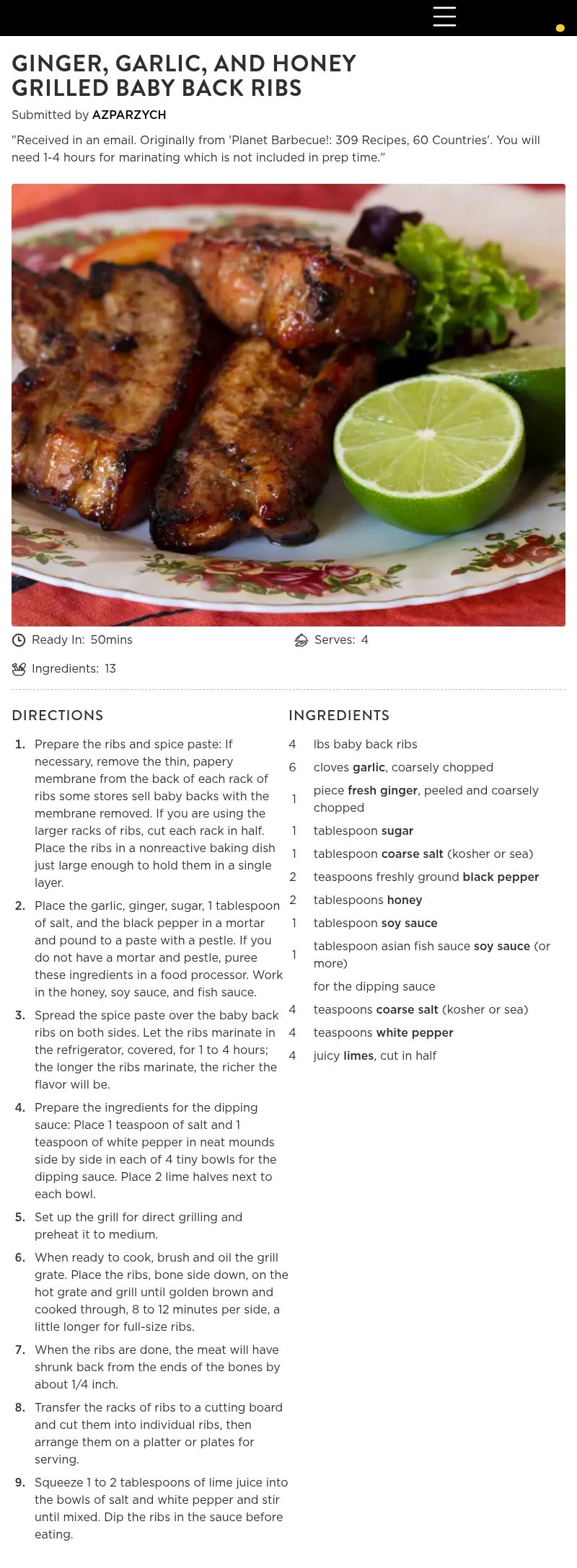 95F outside and DH working from home, I made as directed but oven baked them by wrapping them in foil and placing on a baking sheet (baked at 300F for 2 1/2 hours). Ribs were tender and juicy and had a wonderful mild flavor. The fresh ginger came thru nicely. We too splashed some fresh lime on the ribs after cooking, but preferred them best without the lime. Great recipe, thanks for sharing. Made for PRMR