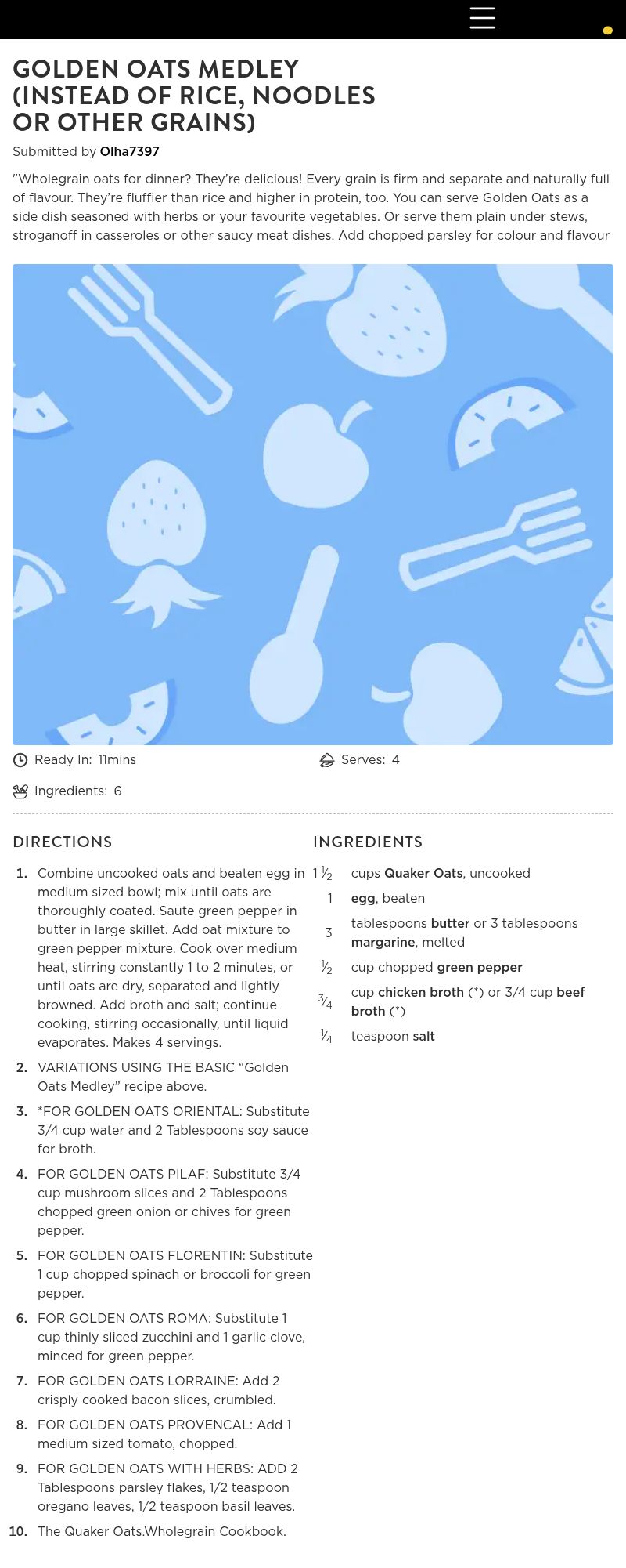 - FOR GOLDEN OATS PILAF: Substitute 3/4 cup mushroom slices and 2 Tablespoons chopped green onion or chives for green pepper.