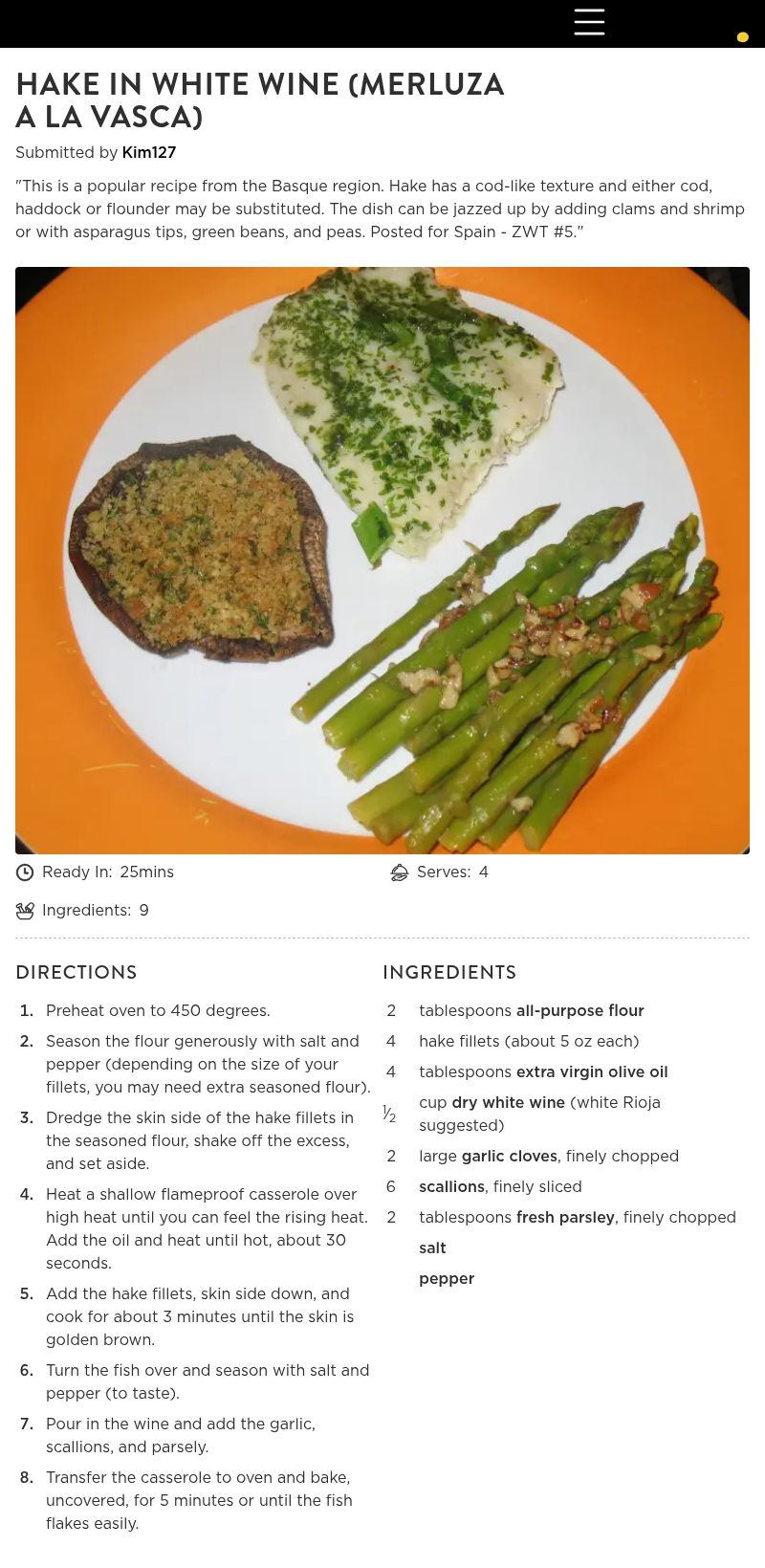 I used skinless flounder, so skipped the frying part, placed in a single layer in a large baking dish, used vermouth instead of white wine - this adds additional herbal notes and works very well with a dish like this. Mine did not brown by the time the fish was done, and had I realized how much liquid was left, I would have made a little sauce to nap the fish with - now the juices are strained and frozen for a future fishy soup. This went nicely with rice and mixed veggies.