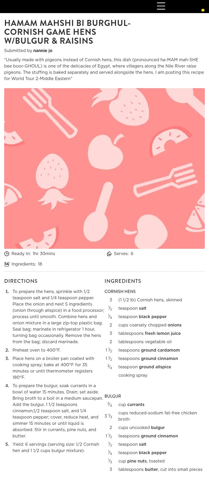 - Yield: 6 servings (serving size: 1/2 Cornish hen and 1 1/2 cups bulgur mixture).