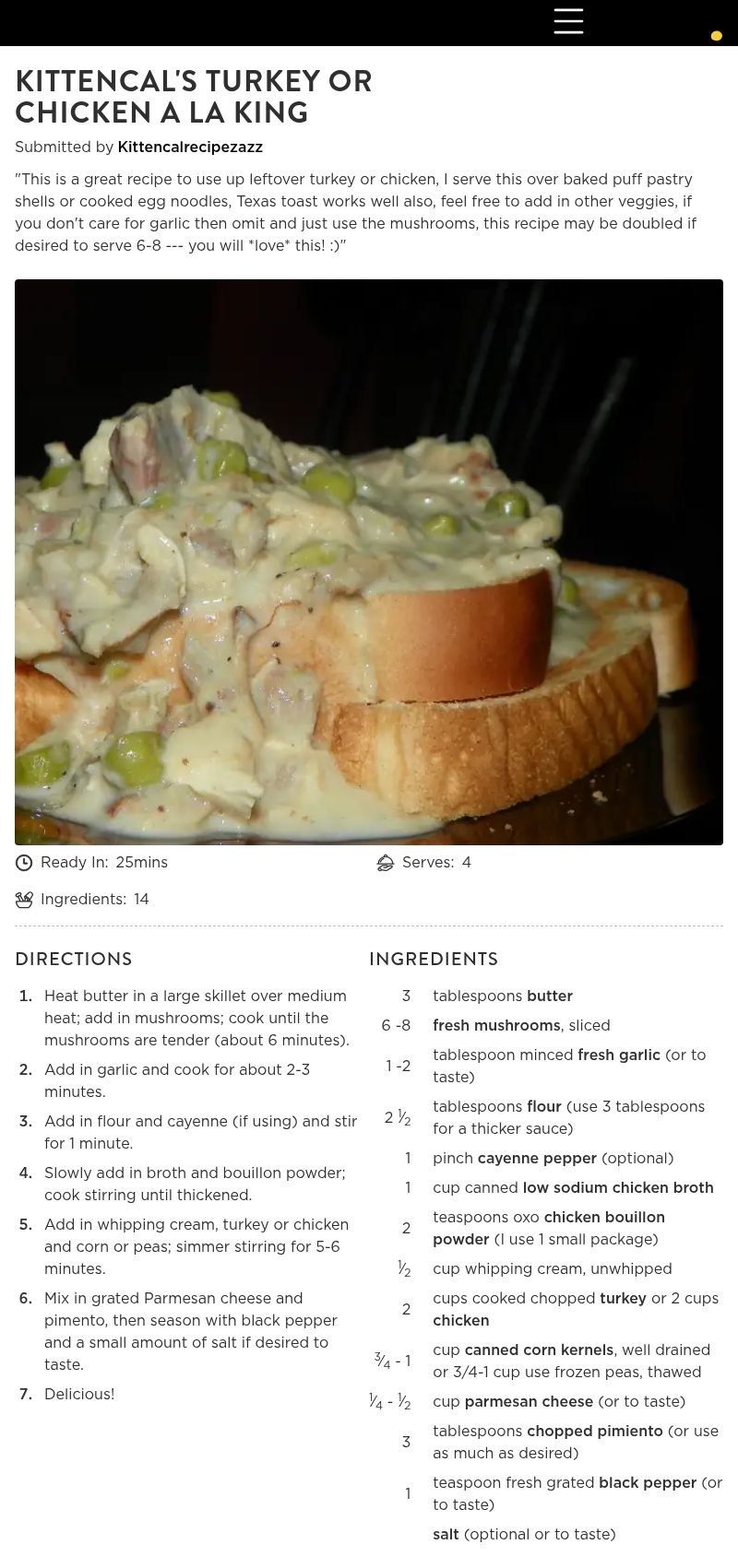 Thank you Kittencal for another "Great Tasting Recipe" that is "Easy to Do", for the leftover cooked chicken that I often have. I didn't have the cooked chicken this time but had everything else. Made with 6 Chicken Tenders that I seasoned and quickly cooked in 1/2 Cup White Wine and 1 Cup Chicken Broth. I did add 2 Tbl minced onion when I cooked the mushrooms & garlic. Other than that, I followed your recipe. Used 3 Tbl flour because I used the broth from cooking the Tenders. The sause, after adding the cream, was perfect. I used my garden peas insted of corn. It does serve 4 for Lunch or 2 for Supper with a salad. I put it on 4 slices of wheat toast and sprinkled some chopped garden parsley on top. It was "awesome" a keeper and a new favorite .