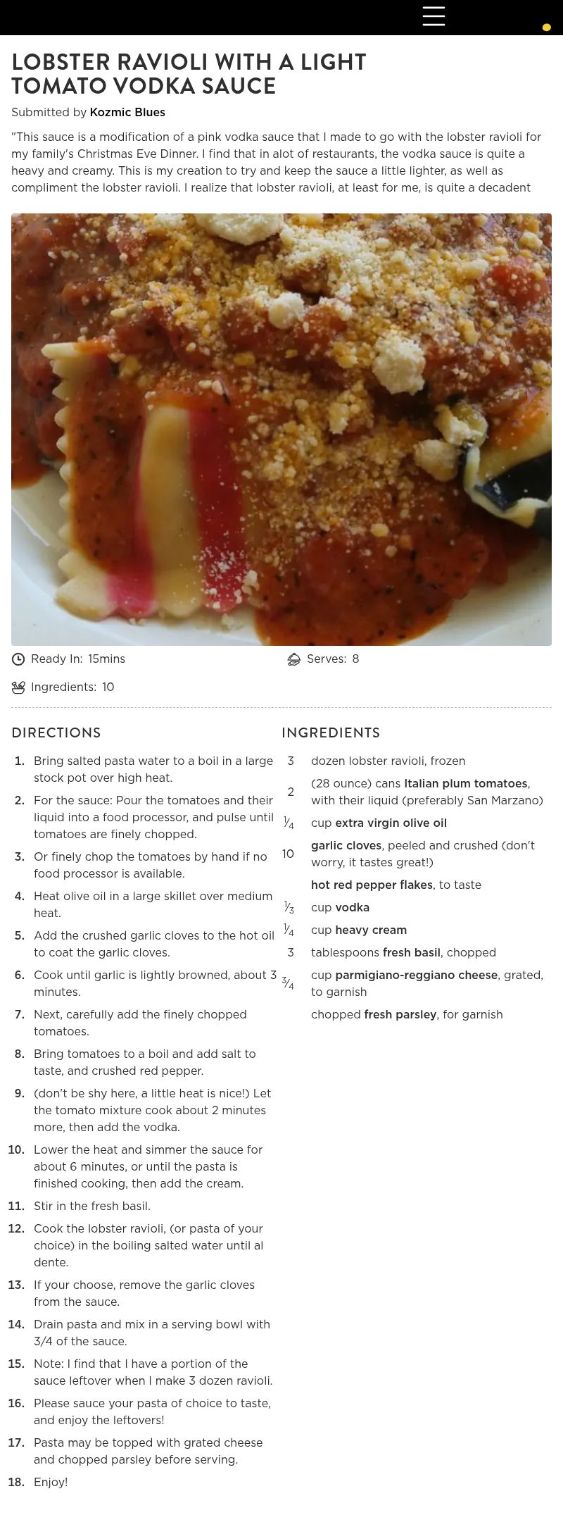 After reading the reviews I thought that this would be a good recipe - but I was disappointed. I made my raviolis using wonton skins and they turned out very good, but the Tomato Vodka Sauce was very disapointing. The listing of the ingredients says 10 garlic cloved, peeled and crushed - that is what I did. Then later in the recipe it says to remove the garlic cloves - somehow I missed that when I first read the recipe. I took that to mean that the garlic should be put through a garlic press. I think the recipe meant to say "smashed" which I believe would be to take a knife smash the garlic - not crushed. So I found that the garlic was too much for me and I love garlic. The wonton skin Raviolis turned out great - not sure I would try to make the sauce again.
