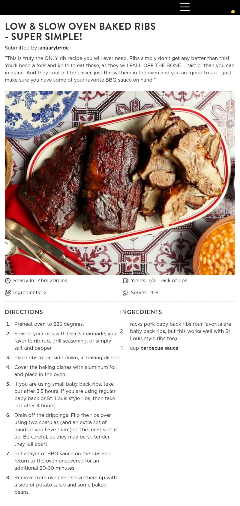 With my wife away visiting my eldest daughter, and me at home managing three teen sons, I was searching for an easy, tasty recipe other then my staples of spaghetti, tacos, pizza, and Italian beefs. My wife has fixed ribs before, but usually used the boil and grill method. Seeing this one explained so clearly, and seemingly so easy, I thought I'd try it. I had two slabs of ribs and baked them at 225 for five hours (I had to run up and pick up something so they were in an hour over what it said). Even after 5 hours, the ribs were juicy, tender, and falling apart. I think having it covered gives it a lot of leeway in the cooking department, along with the low temp. Adding the sauce and baking it on uncovered for 25 minutes gave me ribs that I can honestly compare with restaurant quality (unless you want grilled of course). We make our own BBQ sauce as we like it spicy, so all I can say is EASY, FOOLPROOF, and DELICIOUS!!