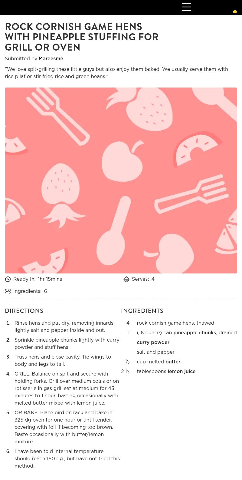 Cooked this for my family and it was a big hit. Has a wonder favor. i did make a mixture of olive oil, paprika and garlic powder, I rubbed the mixture over the hens. Also cook only two hens but used the 16 oz can of pineapple. Baked it in the oven. Internal temperture was 170. Will certainly be cooking quite often.