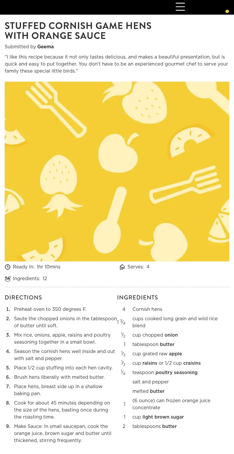 - Cook for about 45 minutes depending on the size of the hens, basting once during the roasting time.
