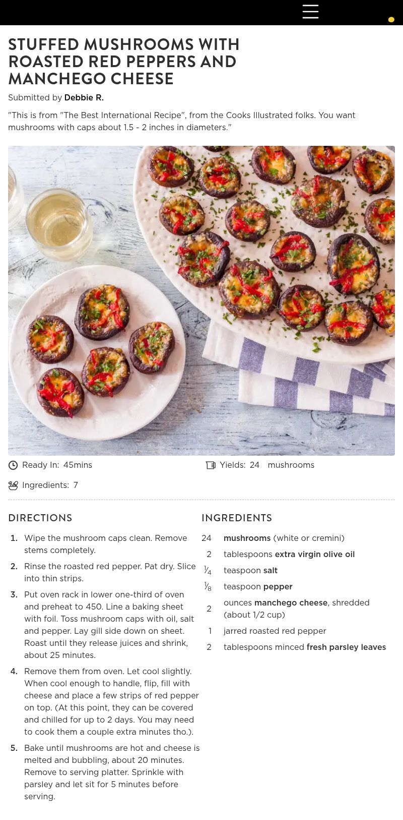 Between the green of the parsley and the red of the roasted red peppers, this would make a perfect appetizer for a Christmas party! However, we brought it to a New Year's Eve hors doeuvres party, and it was the first thing to disappear! Can't get whole creminis easily where we live, so used white 'shrooms. A definite crowd pleaser.
