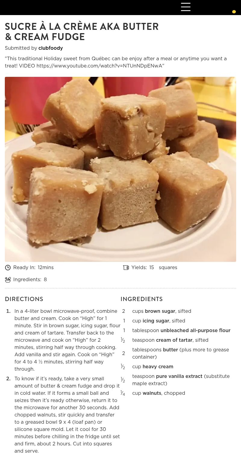- To know if it’s ready, take a very small amount of butter & cream fudge and drop it in cold water. If it forms a small ball and seizes then it’s ready otherwise, return it to the microwave for another 30 seconds. Add chopped walnuts, stir quickly and transfer to a greased bowl 9 x 4 (loaf pan) or silicone square mold. Let it cool for 30 minutes before chilling in the fridge until set and firm, about 2 hours. Cut into squares and serve.
