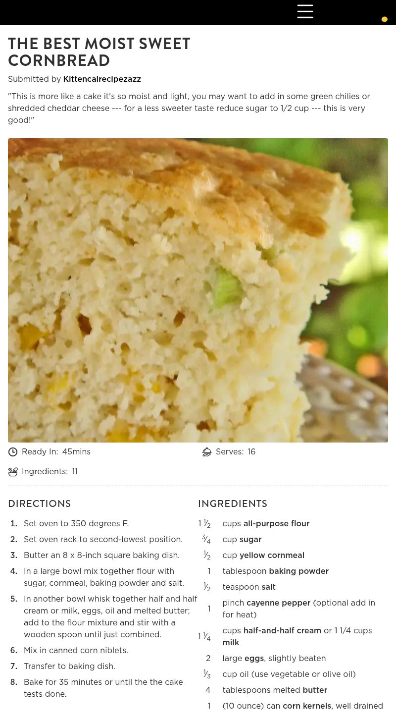 This is so good, and so foolproof. I have made it several times. I cut the sugar to 1/2 cup and it's perfect. I do add most of a can of corn, and usually add some canned (drained) green chilies, though I didn't have any tonight. I bake it in a cast iron pan, and the crust is just perfect. I probably bake it a tad longer, but it always depends on the good ole toothpick test!