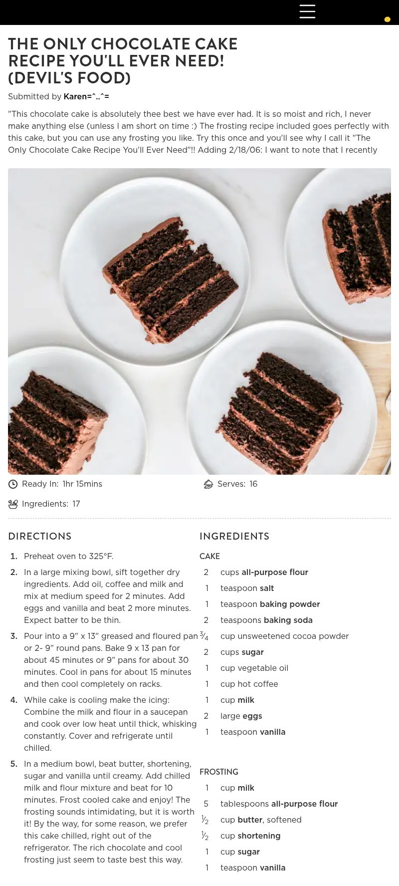 I wanted to make this recipe: The website offers units in US and Metric. Since I do a lot of baking, I prefer using metric. The metric conversions are so off, it's a disaster. For example, the recipe calls for 2 cups of sugar, the website converts to approx 473g, that's not right! 2 cups of granulated sugar is only 402g. Look at flour which is 2 cups, converts to 473g again, but 2 cups of flour is only 240g. So 473g is actually 3-3/4 cups, not 2! Cocoa powder is 3/4 cup, but converts to 178g, once again 3/4 cup of cocoa powder is only 75g. This is nuts. The end result is a recipe mixture that looks like thick fudge brownie, not cake batter!!! If the website cannot offer accurate conversions, then just turn the feature off!!